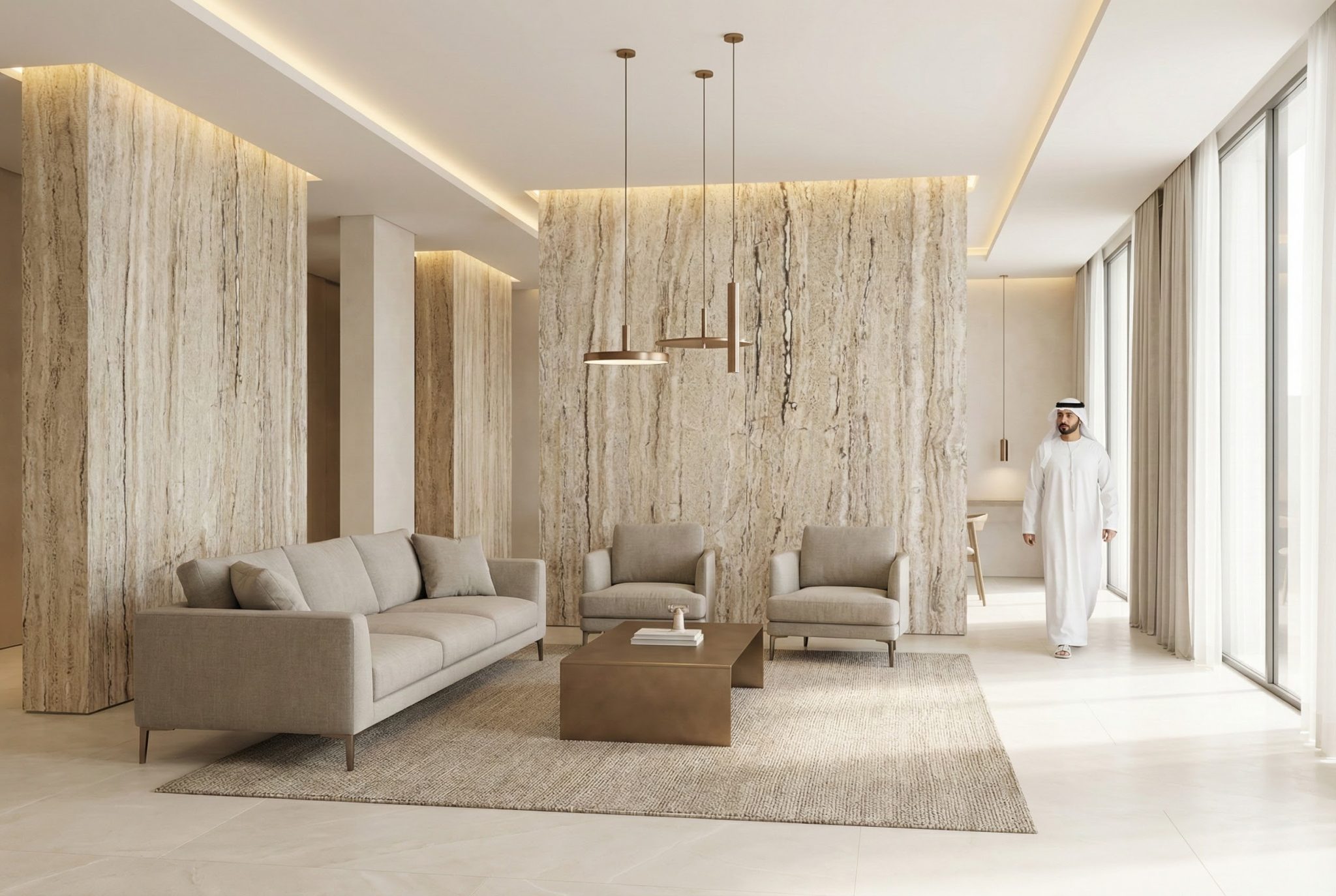 Due to its powerful visual presence, CNT 009 Travertine is an unparalleled choice for use as a “feature wall” in the interiors of modern villas and penthouse apartments. Furthermore, its lasting durability and beauty make this stone a smart choice for the exterior facades of premium commercial buildings and five-star hotels in climates like Dubai.